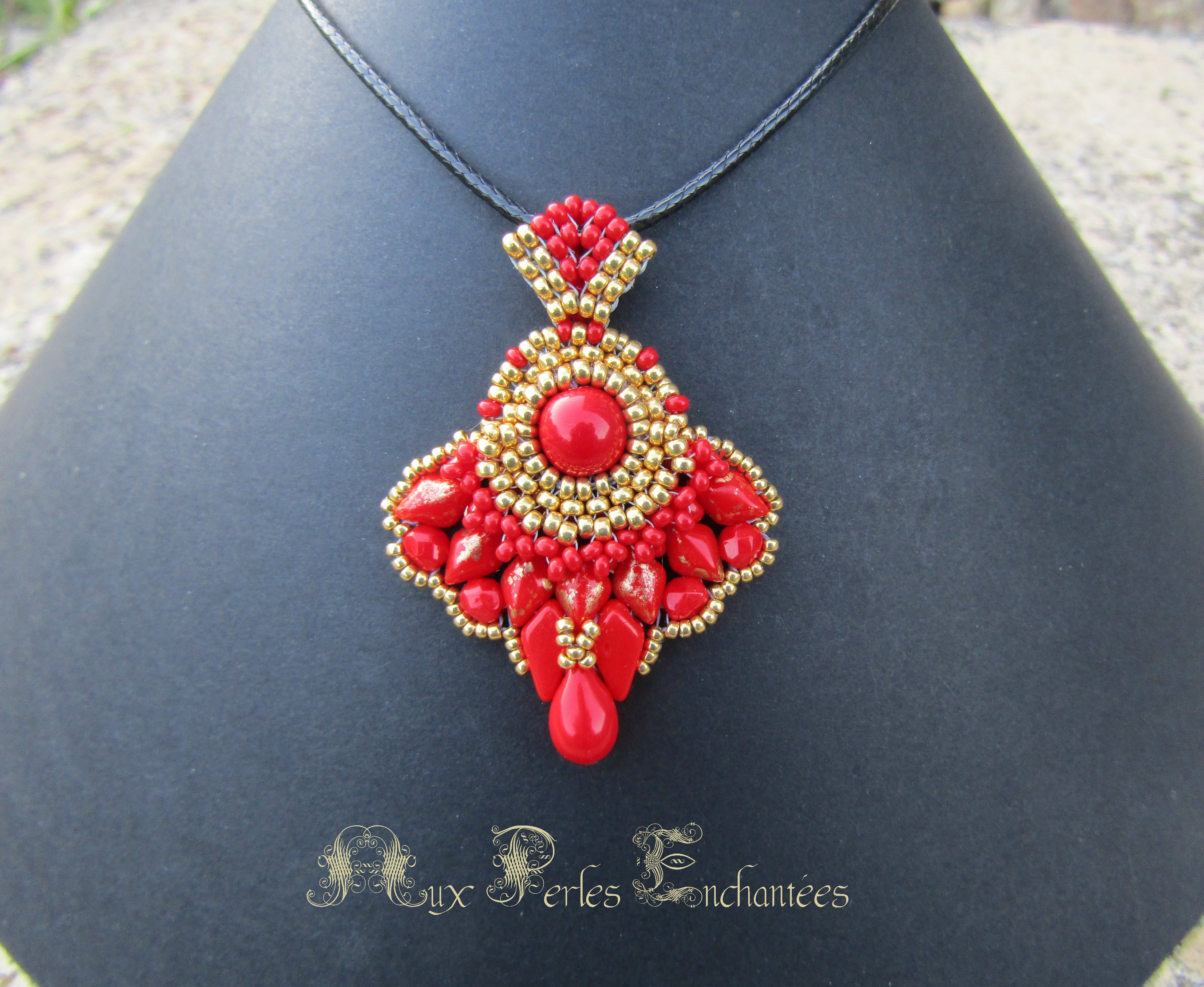 Ce magnifique pendentif Isis est composé de perles en verre, gemduos, kite, goutte et perles de rocailles Miyuki Duracoat (galvanisation sur les perles Miyuki, pour une meilleure tenue des couleurs)