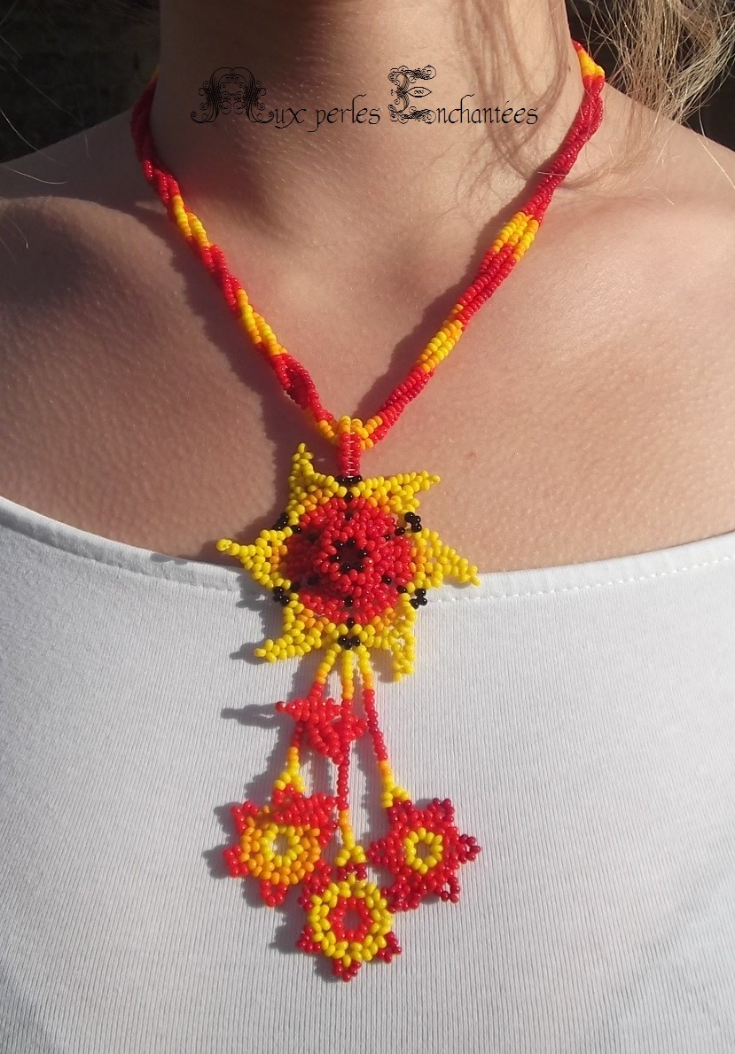 Ce collier est réalisé suivant les techniques de tissage des indiens Huichol. Il est réalisé à partir de perles de rocailles jaunes, oranges et trois teintes de rouges.