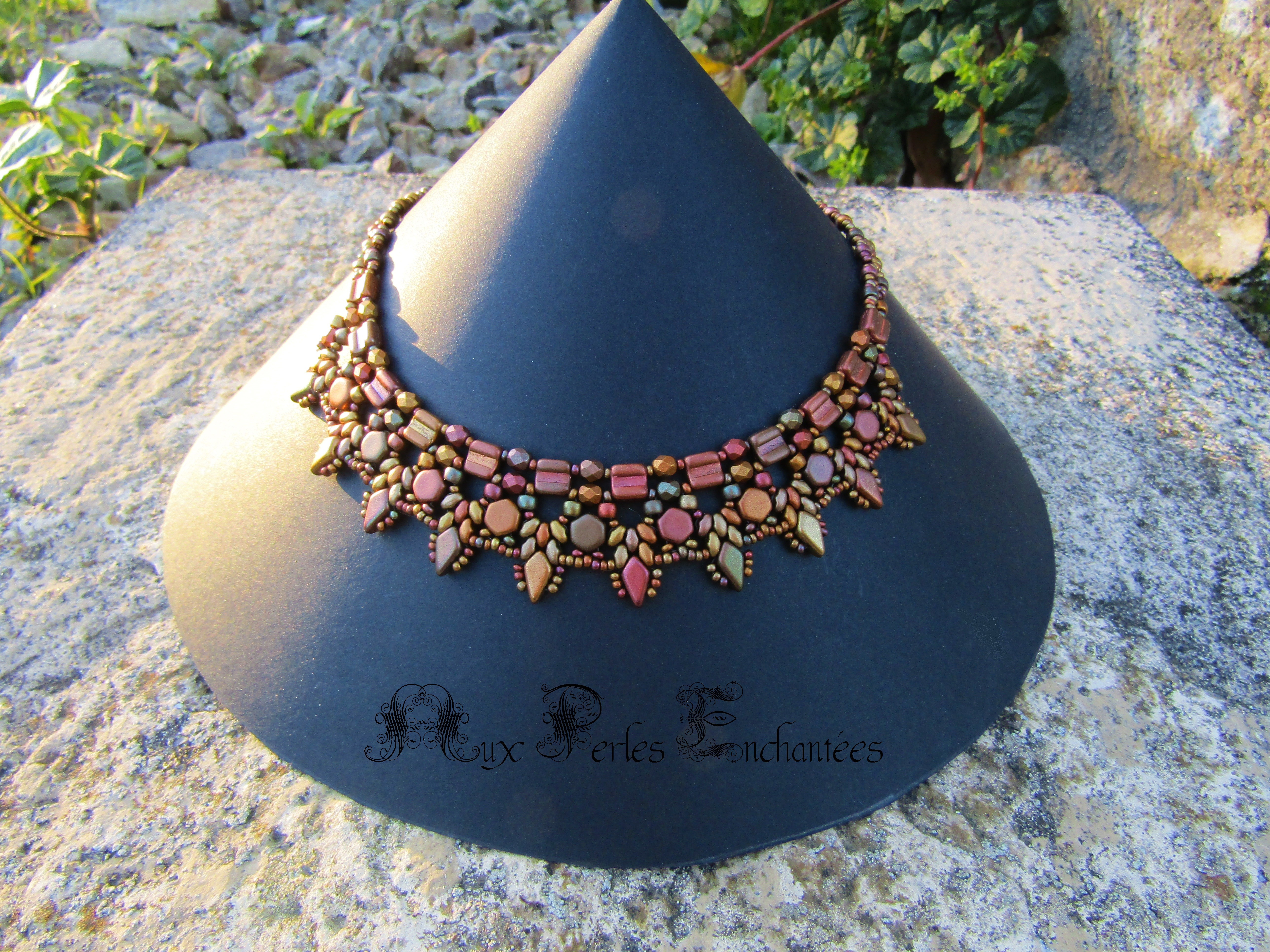 Ce magnifique collier, une création personnelle, est composé de perles en verre tchèques, groovy tiles, honeycombs, kites, miniduos, facettes de bohème et perles de rocailles Métallic iris satin.