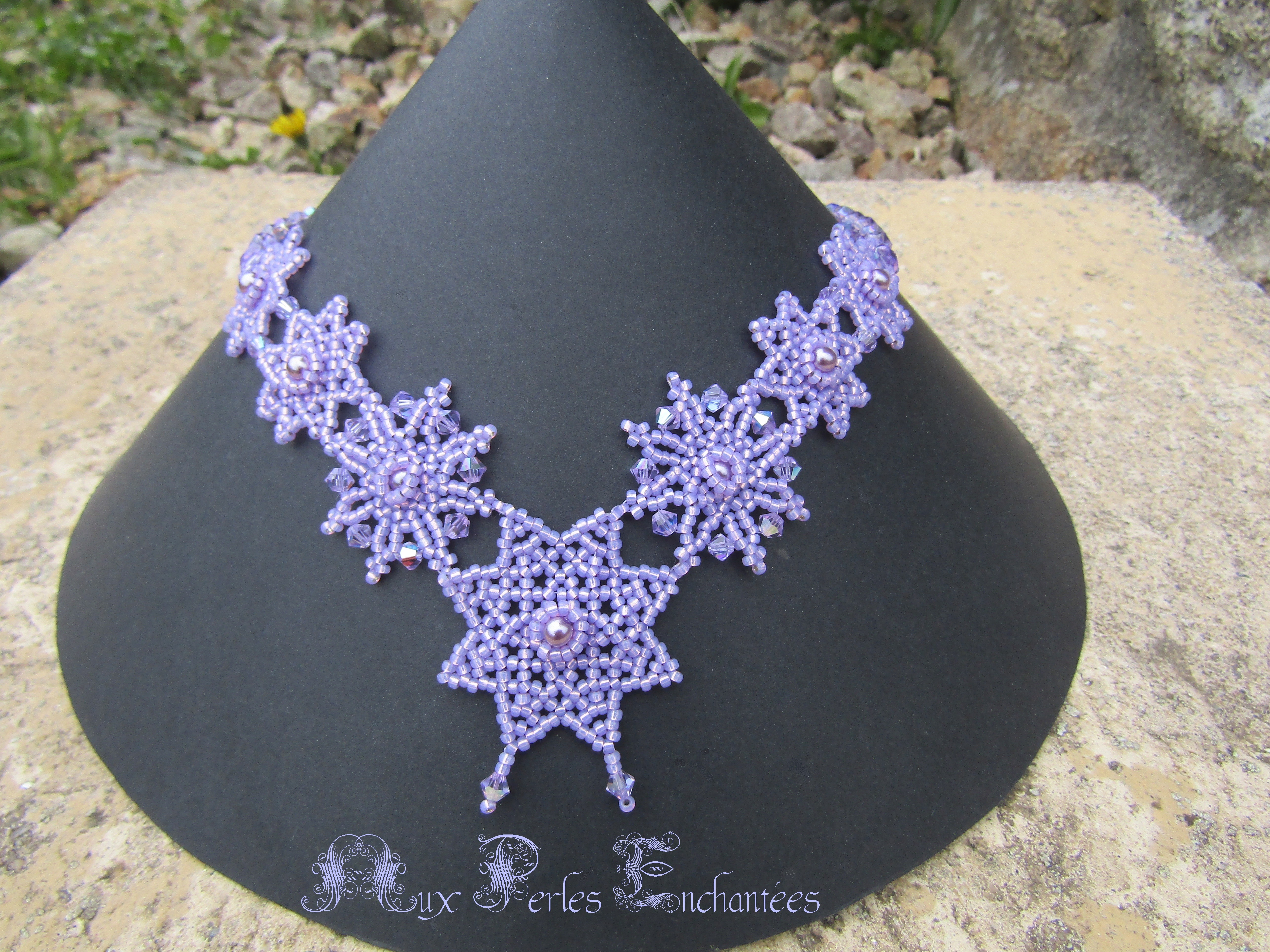Ce ravissant collier est composé de 7 étoiles réalisé avec des perles de rocailles de grande qualité Miyuki, perles en verre nacrées, facettes de Bohème et de toupies en cristal de Swarovski