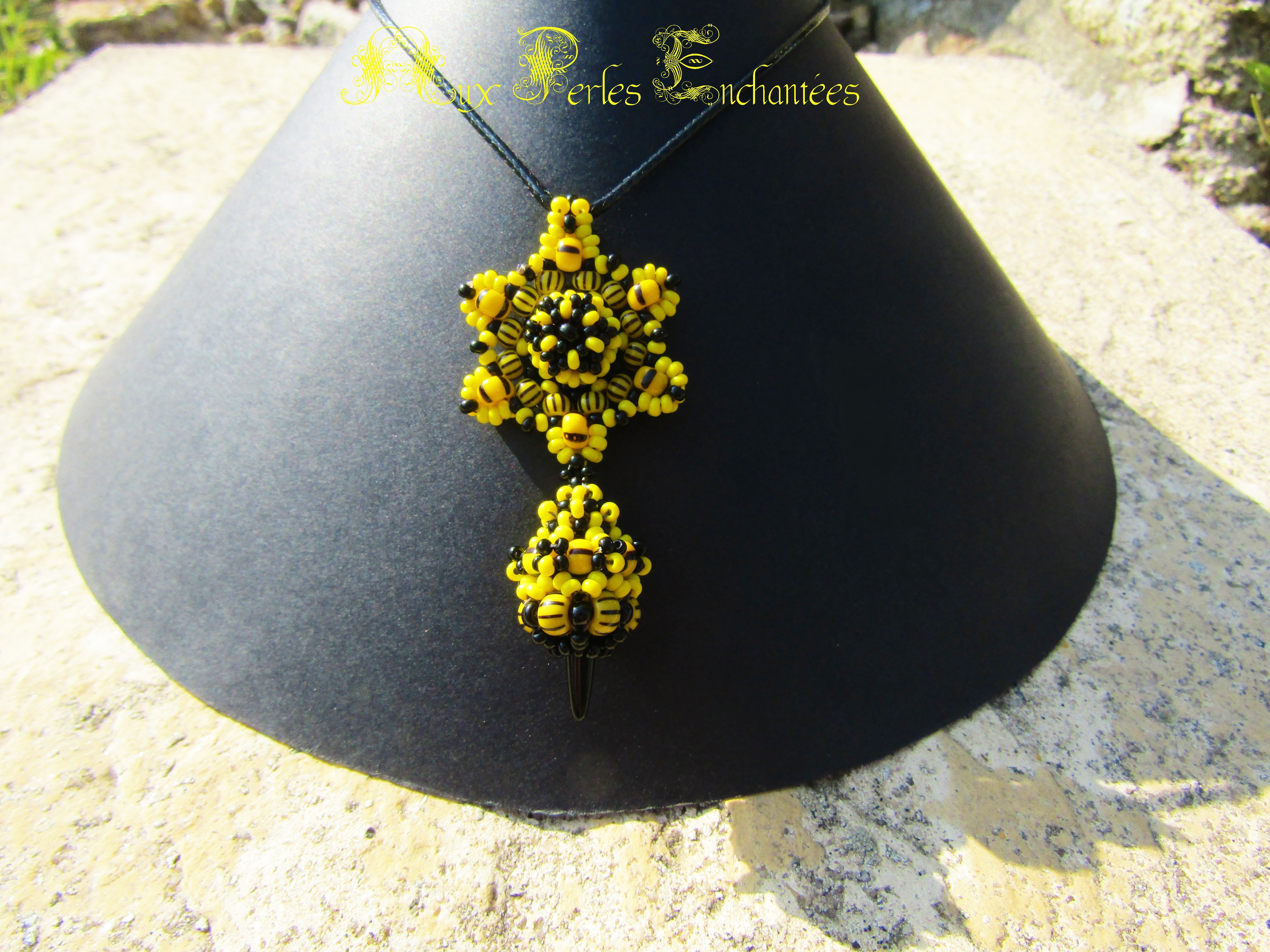 Ce ravissant pendentif est composé de 2 éléments réalisés avec des perles de rocailles de différentes tailles et d'un thorn en verre. Le pendentif est monté sur un cordon en polyester et acier inoxydable de 45cm + 5 cm de chaine d'extension